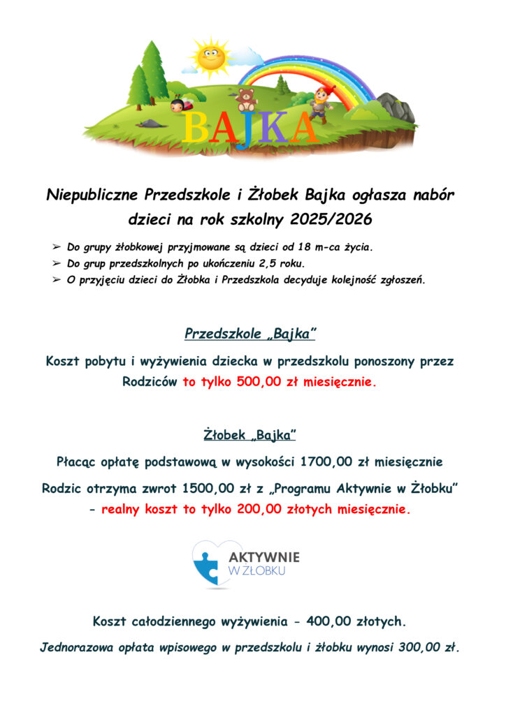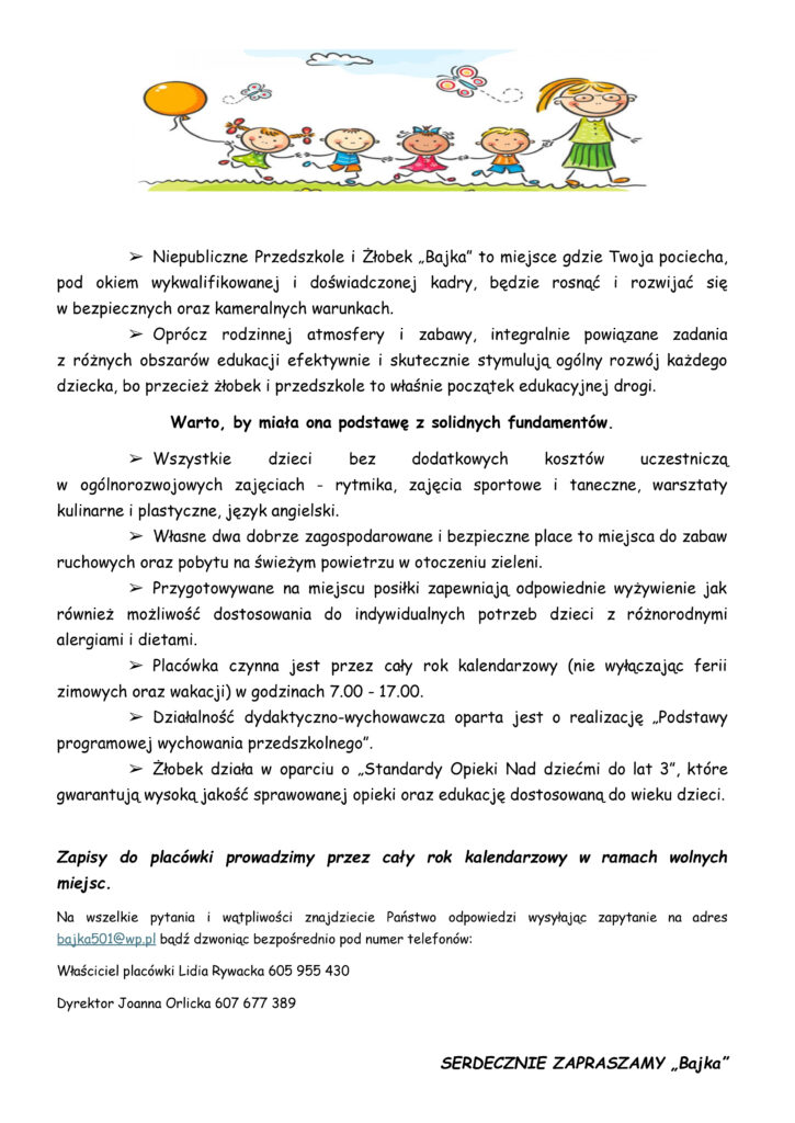 Właściciele iPracownicy przedszkola Bajka pragną złożyć wszystkim dzieciom iich rodzinom najserdeczniejsze życzenia zdrowych, szczęśliwych, spokojnych icudownie przeżytych Świąt Bożego Narodzenia. Jak naświątecznym stole znajduje się dużo dobroci, życzymy Państwu, aby nigdy niezabrakło jej wWaszym życiu. Żyjcie wzgodzie zesobą ibliskimi orazwzdrowiu, niechwnadchodzącym roku spełniają się wszystkie najskrytsze marzenia! Radosnych, pełnych...